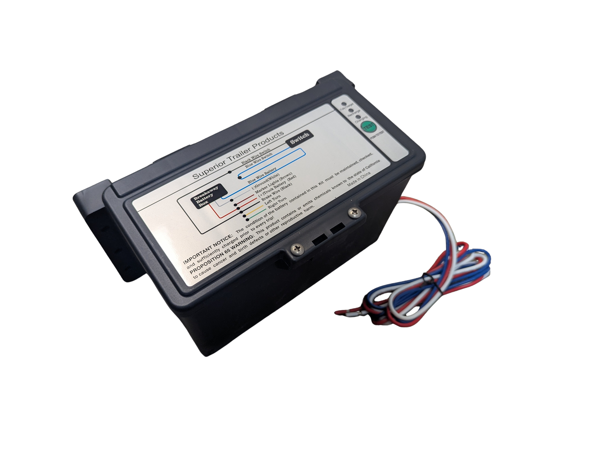 - Kit includes 12 Volt 10 Amp Hour battery, breakaway switch, 1-amp charger, battery box, and wiring